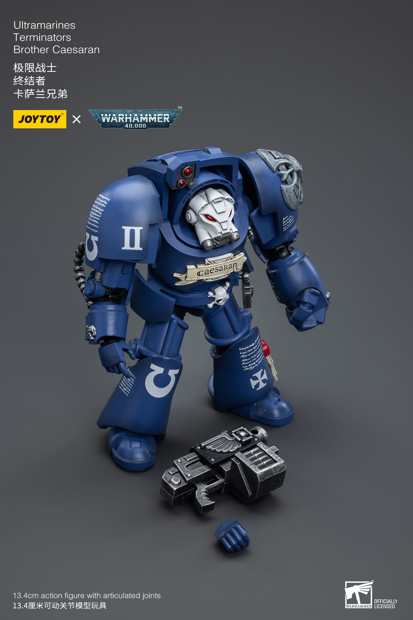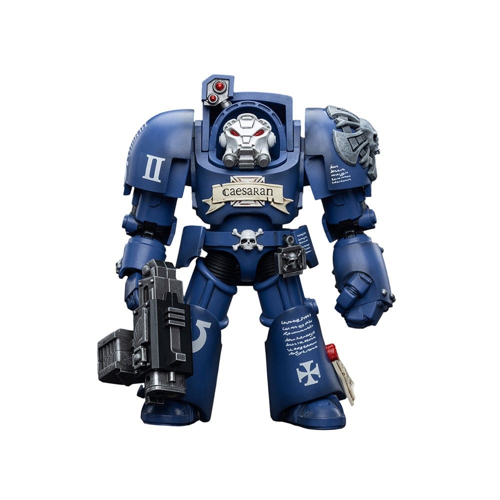 Figurka Warhammer 40k (Ultramarines) - Terminators Brother Caesaran o wysokości około 13 cm (skala 1:18). Wzorowana jest na wizerunku postaci znanej z tej niezwykle popularnej gry RPG. Została przygotowana i wydana przez cenionego producenta figurek kolekcjonerskich, firmę Joy Toy.