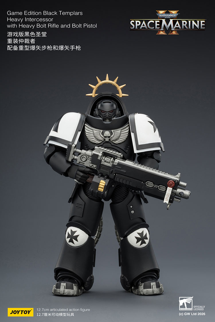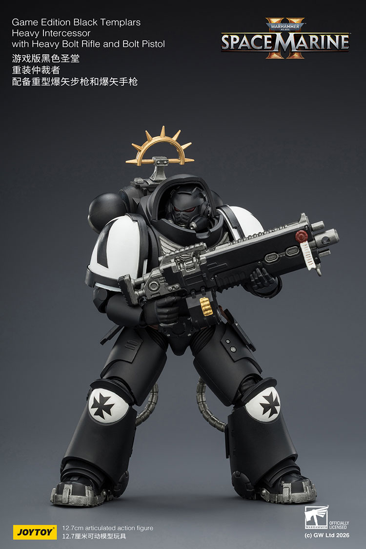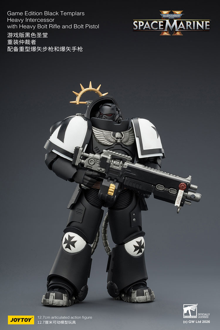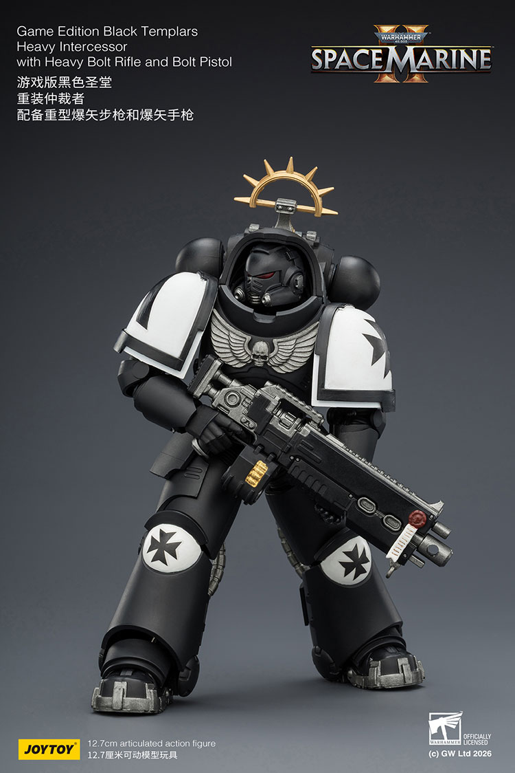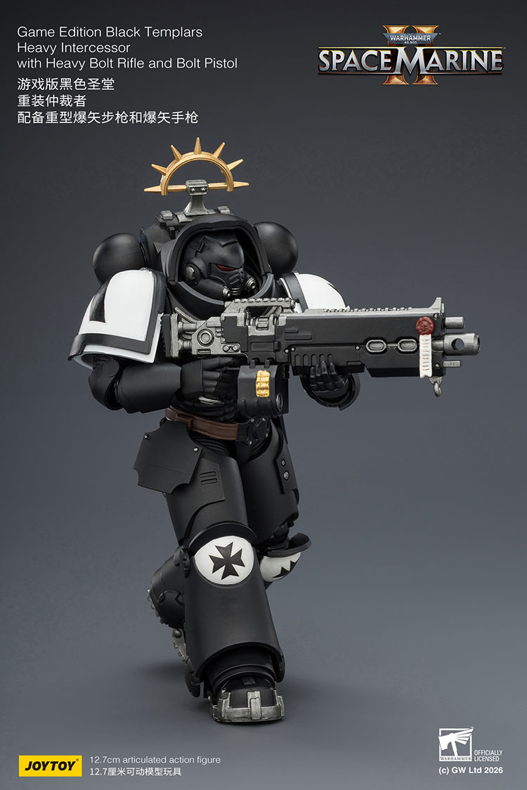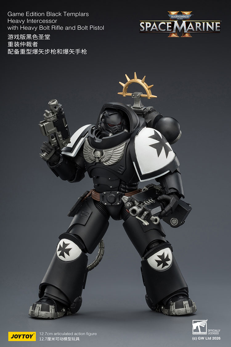Figurka Warhammer 40k - Black Templars Heavy Intercessor o wysokości około 13 cm (skala 1:18). Wzorowana jest na wizerunku postaci z gry komputerowej Warhammer 40K: Space Marine 2. Została przygotowana i wydana przez cenionego producenta figurek kolekcjonerskich, firmę Joy Toy.