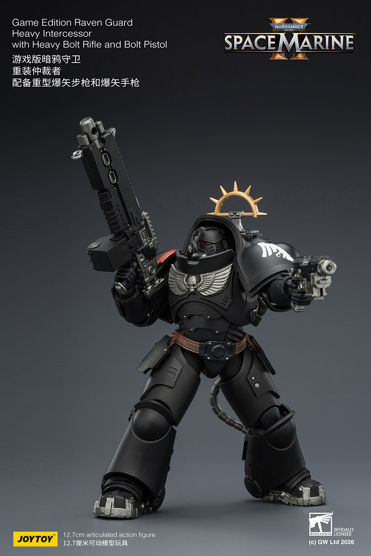 Figurka Warhammer 40k - Raven Guard Heavy Intercessor o wysokości około 13 cm (skala 1:18). Wzorowana jest na wizerunku postaci z gry komputerowej Warhammer 40K: Space Marine 2. Została przygotowana i wydana przez cenionego producenta figurek kolekcjonerskich, firmę Joy Toy.