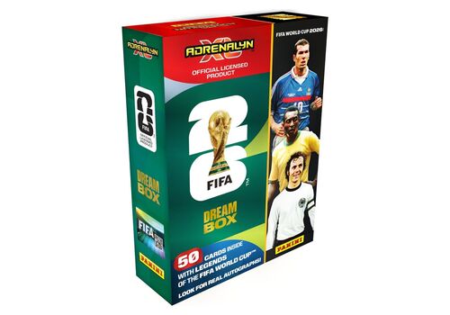 Zestaw FIFA World Cup 2026 Adrenalyn XL - Dream Box zawiera 25 losowych kart, 24 ekskluzywne karty FIFA World Cup Legends, 1 karta ekskluzywna Dream Box Momentum. Na każde 100 pudełek Dream Box jedno z nich zawiera limitowaną kartę z autografem.