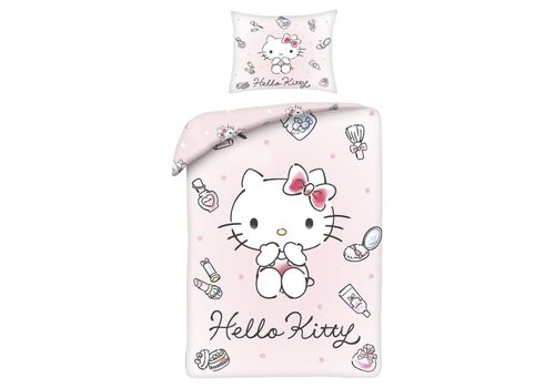 Komplet poszewek na pościel wykonany na pełnej licencji marki Hello Kitty. Składa się on z poszewki na poduszkę oraz poszwy na kołdrę z naniesionym wizerunkiem tytułowej bohaterki.