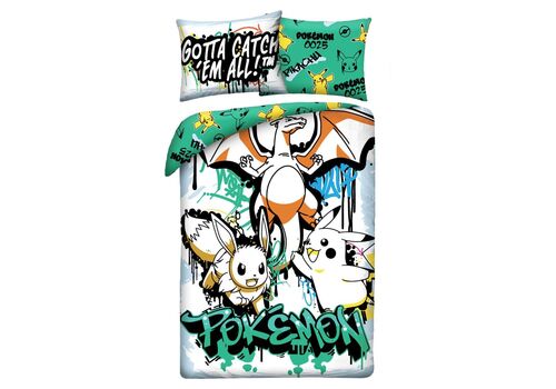 Komplet poszewek na pościel wykonany na pełnej licencji marki Pokemon. Składa się on z poszewki na poduszkę oraz poszwy na kołdrę z naniesionym wizerunkiem bohaterów serii.