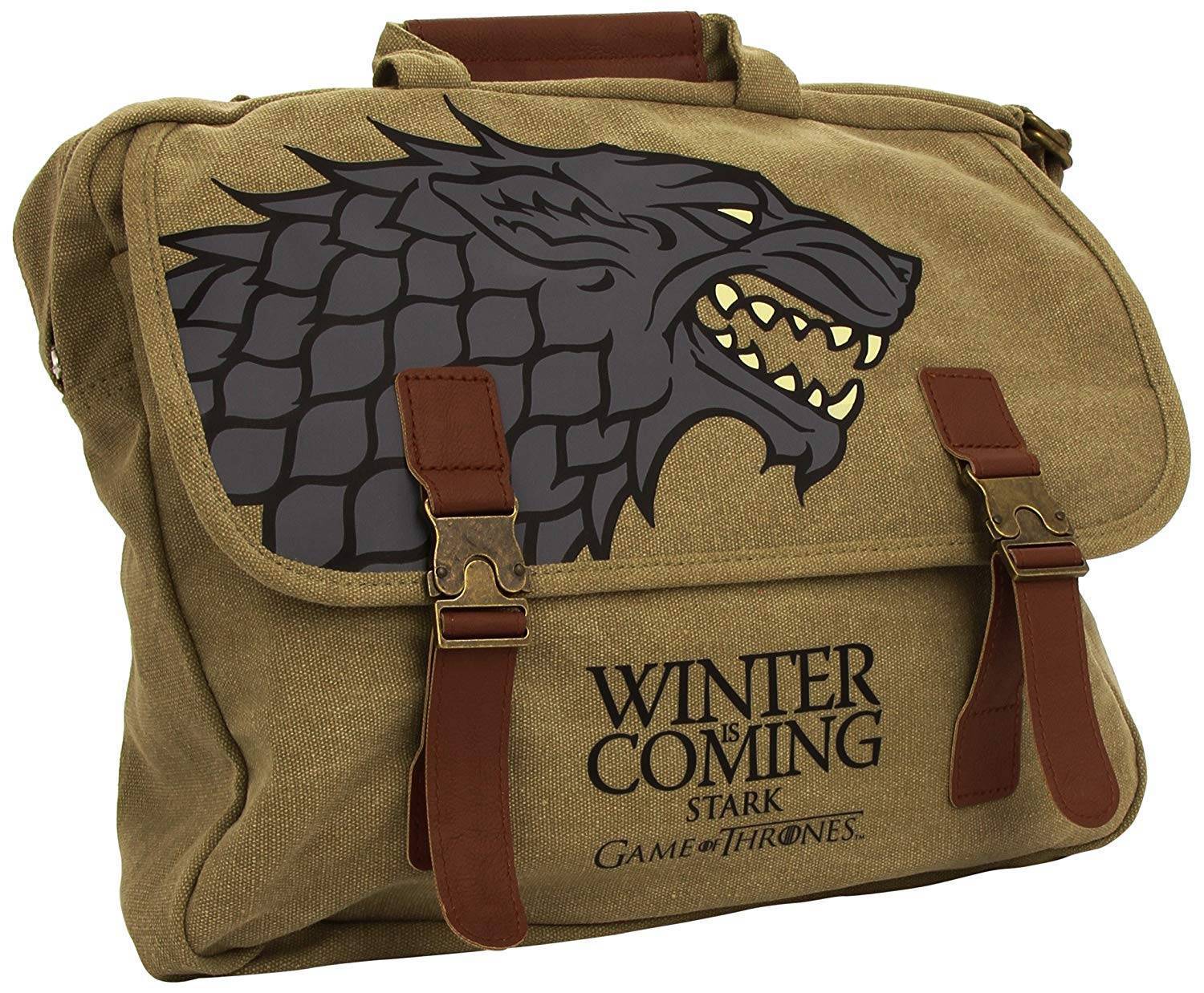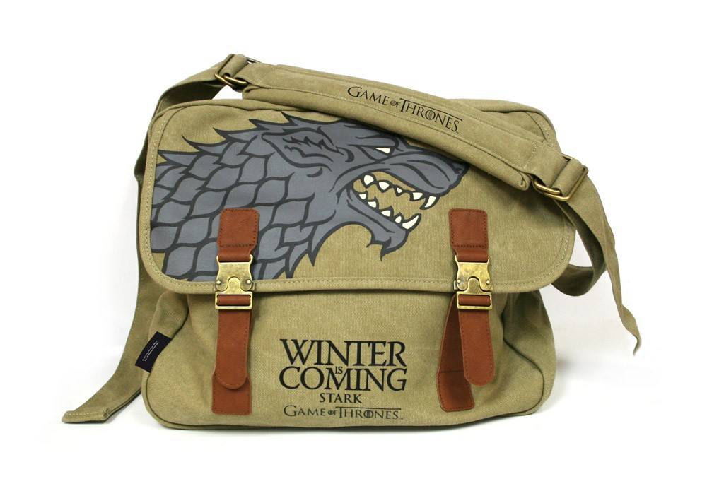 Torba Gra o Tron posiada nadruki: herbu Stark na przedniej klapce, loga zwrotu Winter is Coming i loga Game of Thrones na przedzie, oraz loga Game of Thrones na górze regulowanego paska.