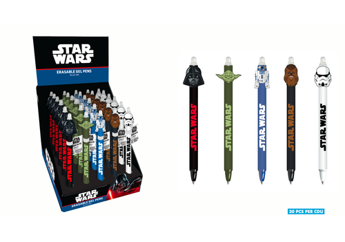 Żelowy długopis z Star Wars wykonany na pełnej licencji marki. Ścieralny za pomocą umieszczonej na nim gumki. Posiada niebieski kolor tuszu oraz nakładkę na kształt bohaterów serii.